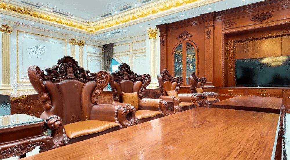 Không gian sinh hoạt trên tầng 2, 3 và 4 được mở ra với phòng khách rộng thênh thang. Vẫn tiếp tục là những chi tiết phào chỉ dát vàng khiến người xem choáng ngợp, chính giữa phòng khách là bộ bàn ghế gỗ được chạm khắc tinh xảo theo phong cách cổ điển.