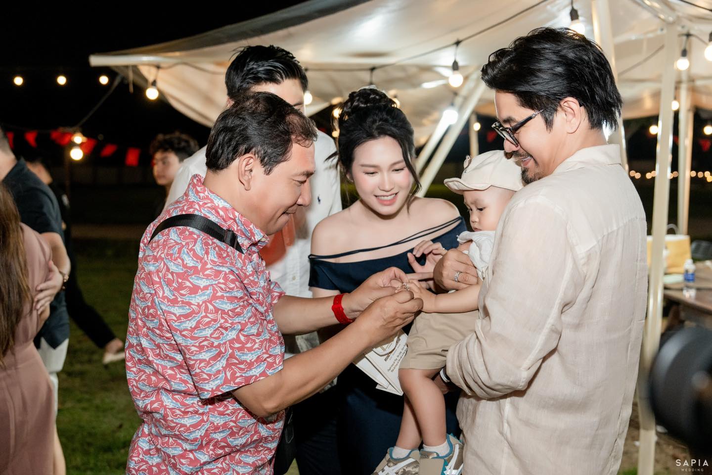 Đáng chú ý không kém là nghệ sĩ Quang Thắng – “chú Thắng mũi to” thân quen với bao thế hệ khán giả. Diện áo sơ mi hoạ tiết đỏ cực nổi, nam nghệ sĩ hào hứng nắm tay bé con của Văn Hậu và Hải My, miệng cười tươi rói. Vợ chồng Văn Hậu nhanh trí thả ngay một câu “xin vía nhiều đất” của “bác Thắng” khiến ai nghe xong cũng phải bật cười. Dân mạng sau đó nhanh chóng lan truyền khoảnh khắc này như một meme “cầu đất”, đặc biệt là trong bối cảnh nhà đất đang hot rần rần trên mạng xã hội.