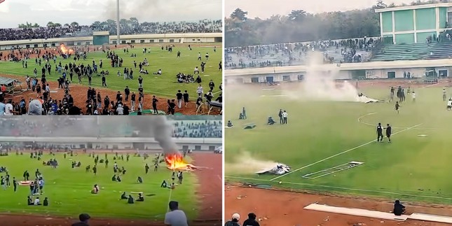Thời điểm này, cảm thấy Persela Lamongan hết hy vọng thăng hạng, các cổ động viên đội chủ nhà bắt đầu đốt pháo sáng, tràn xuống sân đốt phá khung thành. Khung cảnh hỗn loạn bao trùm sân bóng. Lửa khói lan ra nhiều khu vực khiến các cầu thủ phải tháo chạy.