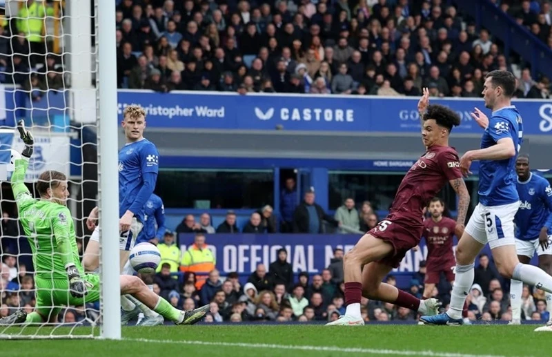 Man City đã rất vất vả trong 85 phút khi họ phải vật lộn để tạo ra những cơ hội rõ ràng, trong khi James Tarkowski đánh đầu trúng cột dọc từ một quả phạt góc cho Everton