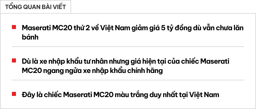 Sang đến năm 2023, chiếc xe được giảm giá xuống còn 19,5 tỷ đồng. Tuy nhiên cho đến nay, chiếc MC20 này vẫn chưa tìm thấy chủ nhân và buộc phải giảm giá sâu. Hiện tại, chiếc Maserati MC20 màu trắng này đang được chào bán với giá 15,9 tỷ đồng, tức giảm gần 5 tỷ so với lúc mới về nước.