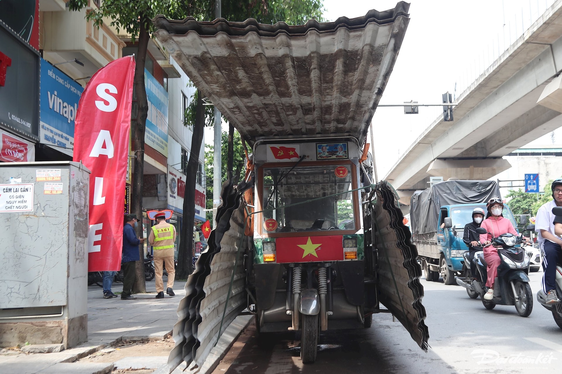Chỉ 10 phút sau, CSGT phát hiện một chiếc xe ba gác do ông V.H.H (thương binh) chở hàng loạt tấm tôn dài lưu thông trên đường gây mất an toàn giao thông.